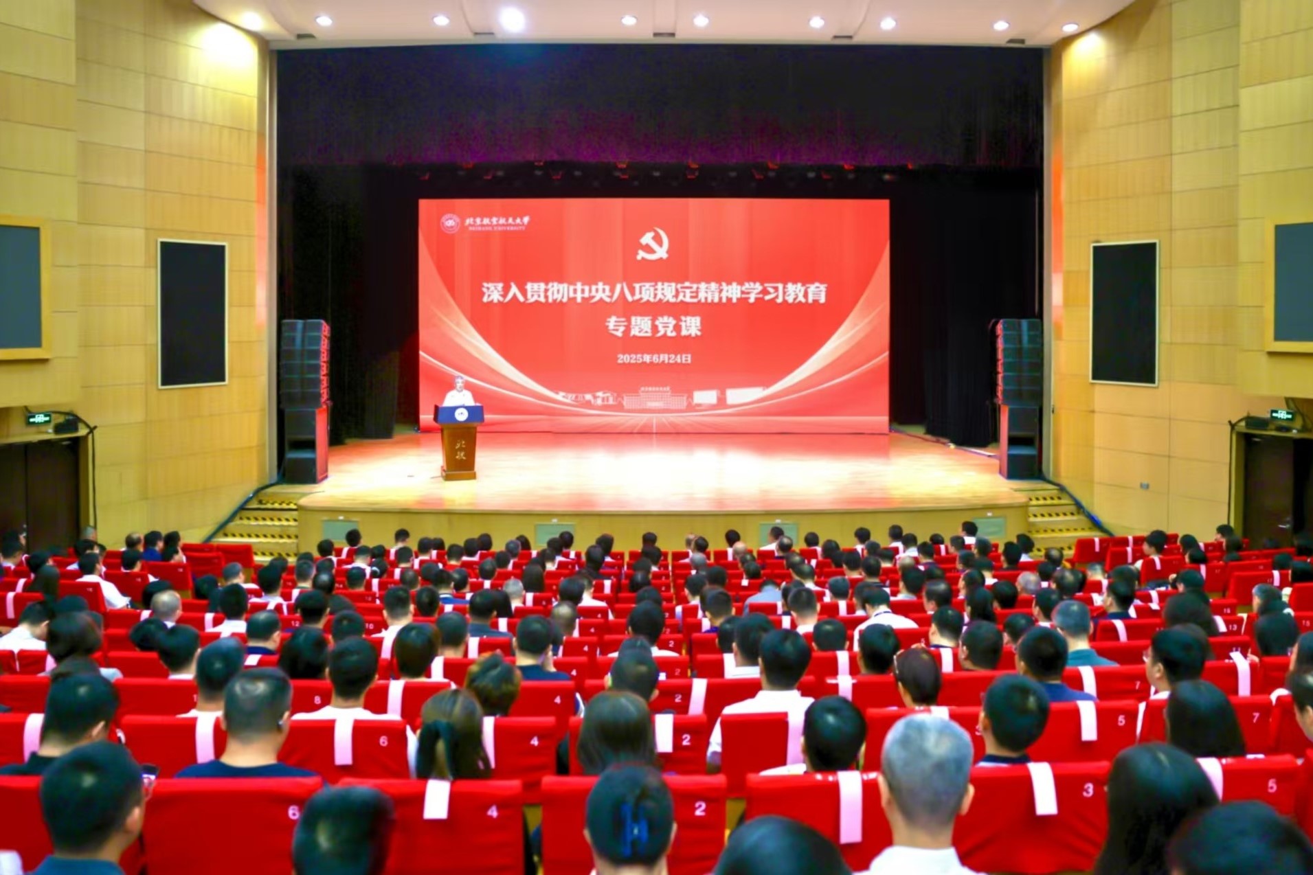 北航新闻网6月24日电(记者 王晴 任和/文 邸白鹭 冯浩/摄影)6月24日上午,北京伊人99党委书记赵长禄以“锲而不舍落实中央八项规定精神 以优良作风推动学校高质量发展”为题讲授专题党课。深入贯彻中央八项规定精神学习教育中央第十一指导组到会指导。全体校领导,校党委委员、纪委委员、全校管理七级岗(含)以上干部、关键岗位重点领域年轻干部、各二级单位党委(党总支)专职组织员、纪检委员等在晨兴音乐厅现场聆听了党课。党课由校长、党委副书记王云鹏主持。