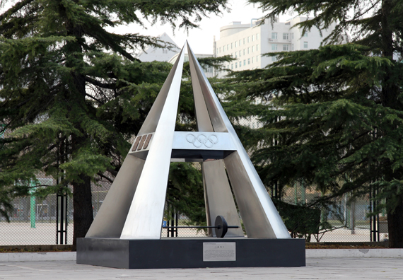 《合力》雕塑主体高3.8米,基层高0.5米,宽3.4米。雕塑造型以北航体育馆的外形为基础,沉稳厚重的钢架结构庄严整合,四根向上生长的不锈钢支柱在最高点交融,象征凝聚的力量。中国奥运举重队获奖运动员在北航师生为他们举行的庆功会上,留下的手模和亲笔签名铸造成青铜,与奥运五环标志一起镶嵌在不锈钢架的四面横梁上,成为三维空间中引人瞩目的视觉中心。基座中央设置的举重杠铃,使体育的竞技性和参与性凝固在时空交错间,让人产生丰富的联想,蕴藏齐心协力、众志成城、坚不可摧的力量源泉,营造了一个寓意深刻、进取无止境的永恒精神空间。